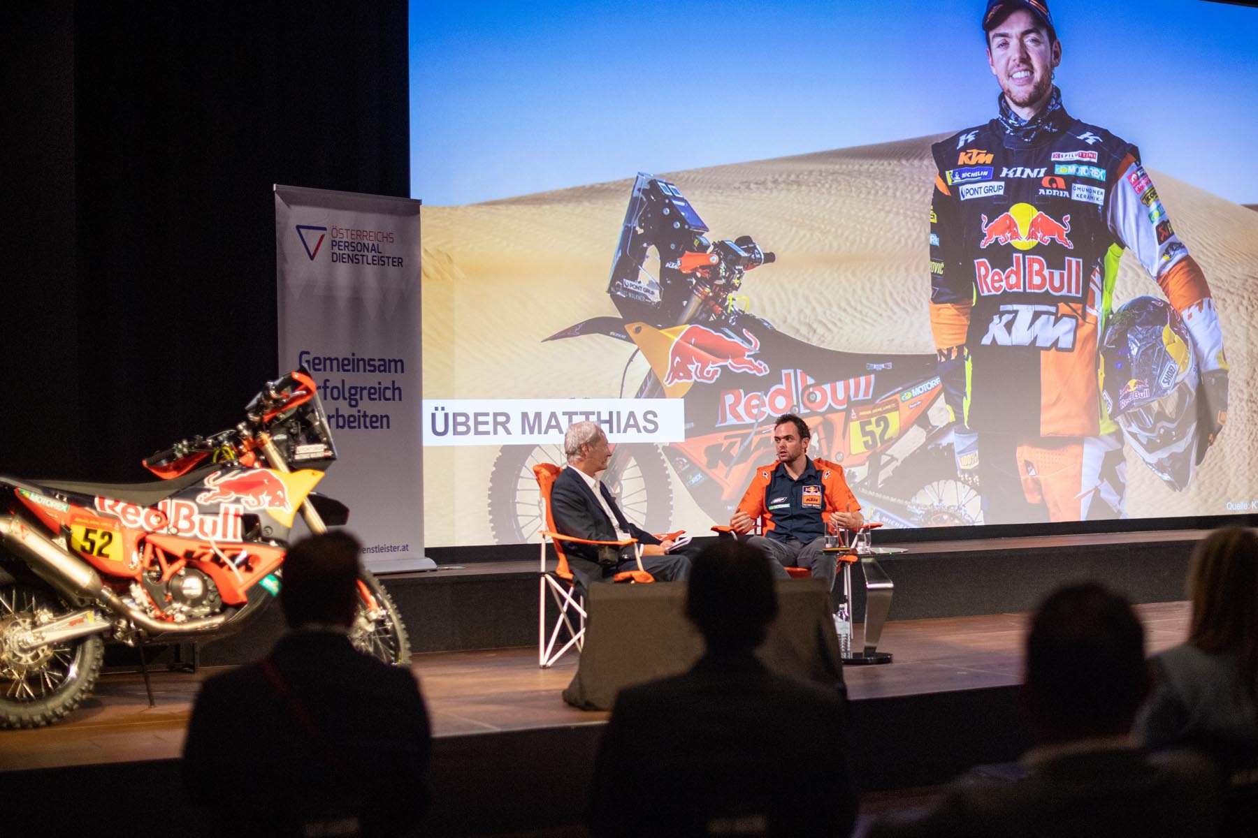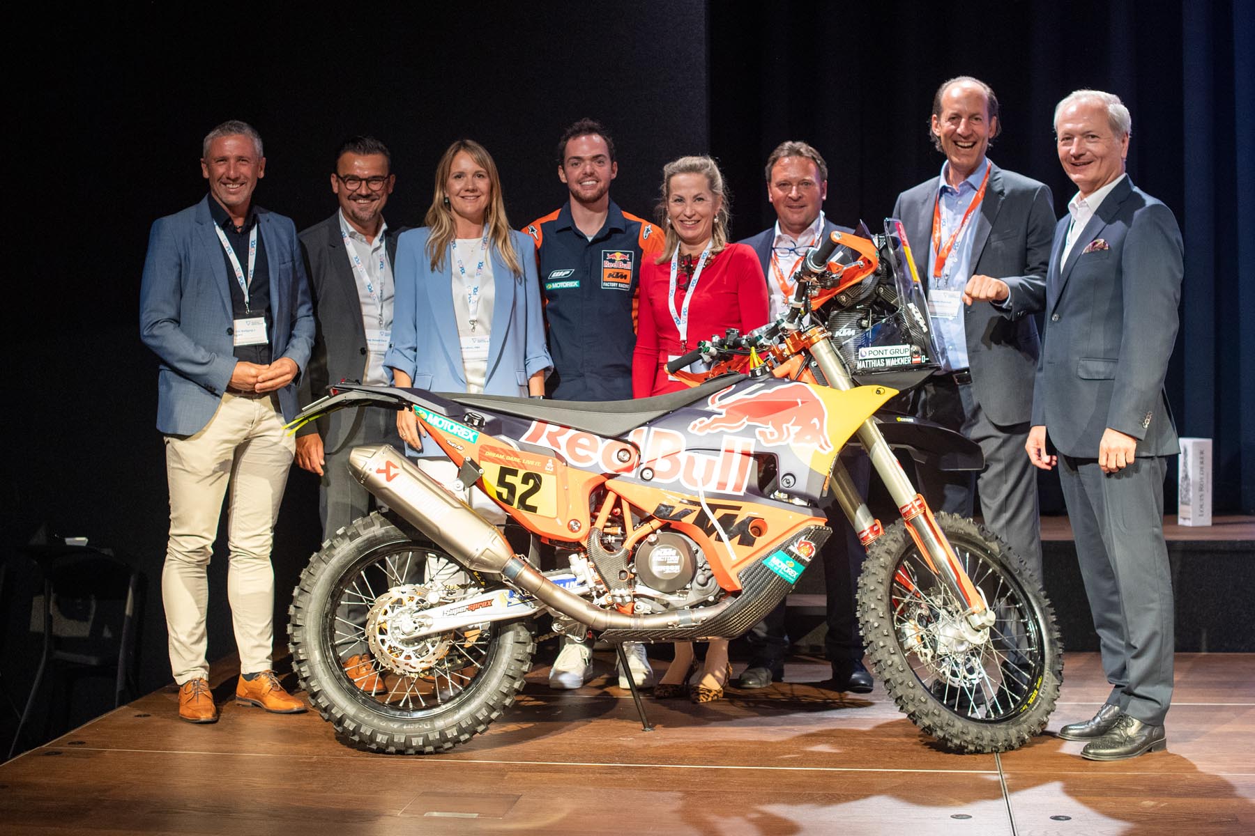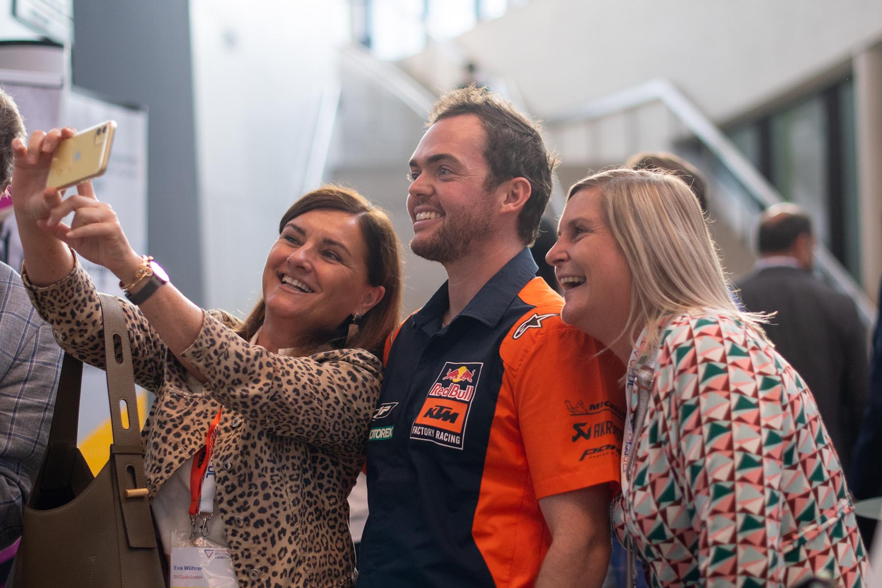 Das größte Highlight des Tages war dann der Talk mit KTM Pilot Matthias Walkner – er hat uns in seiner bodenständigen und charmanten Art von seinen spektakulärsten Rennen berichtet und das Publikum konnte sich einen Eindruck davon machen, wie ein Renntag aussieht und welche Bürden man als Rallyefahrer auf sich nehmen muss. Mit gebrochenem Oberschenkel 12 Stunden auf das ersehnte Krankenhaus zu warten und dann fordert der operierende Arzt zunächst ein Selfie – da muss man Humor haben. Wahrscheinlich ist der Kindertraum vom „Rallyefahrer“ mit Adrenalin Pur gepaart mit vielen Entbehrungen und unter extremen Voraussetzungen nun für den ein oder anderen doch nicht mehr so attraktiv wie gedacht – wobei ein johlendes Publikum von bis zu 600.000 Personen in Südamerika etwas ist, was man nie vergisst. Doch auch hier ist Vorbereitung alles – ob Matthias Walkner das Schlafzimmer zur eigentlich sonst so besinnlichen Weihnachtszeit mit einem Höhenzelt ausstattet oder den Nachbaracker kurzerhand zu einer Rennstrecke umbaut – von nichts kommt nichts.