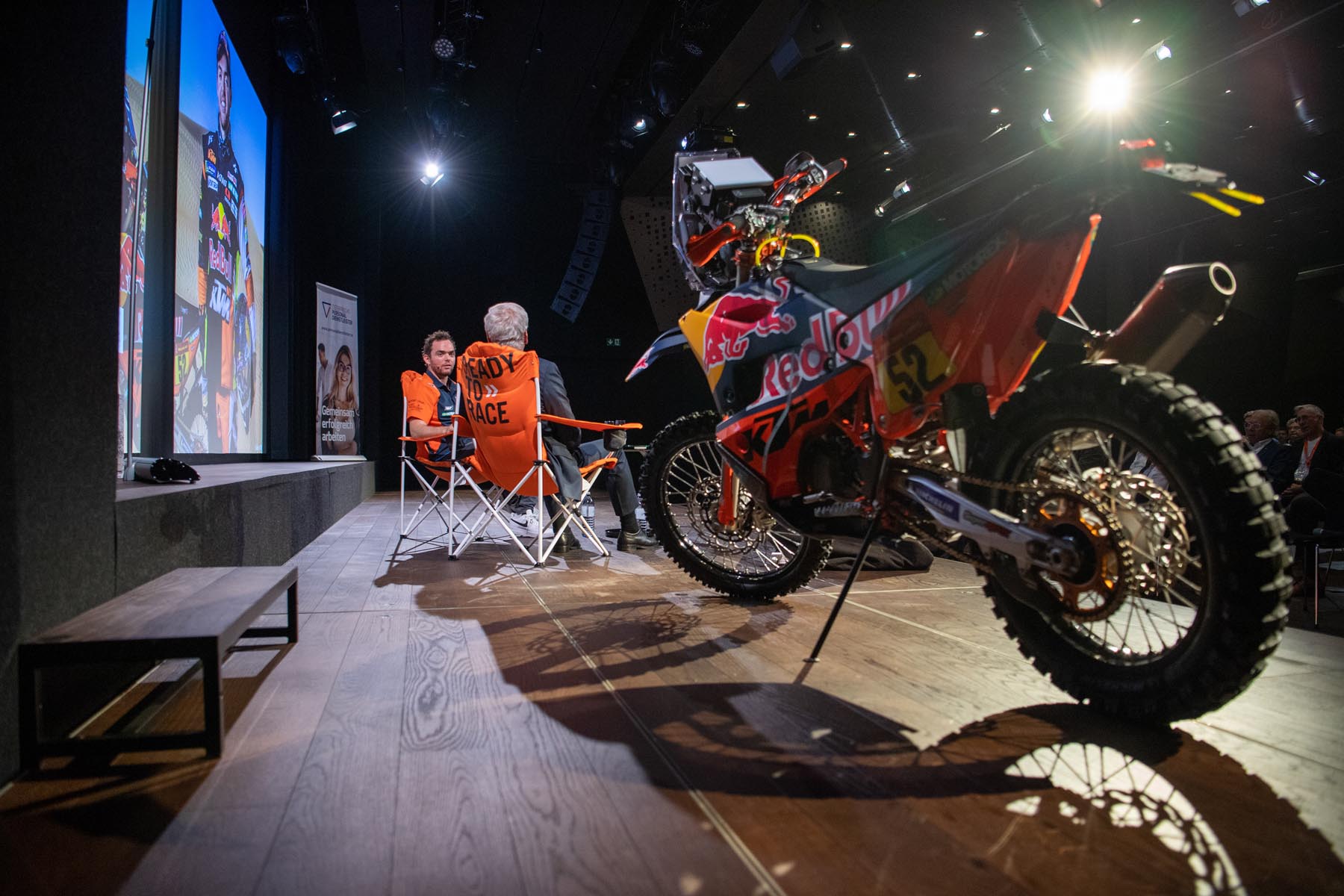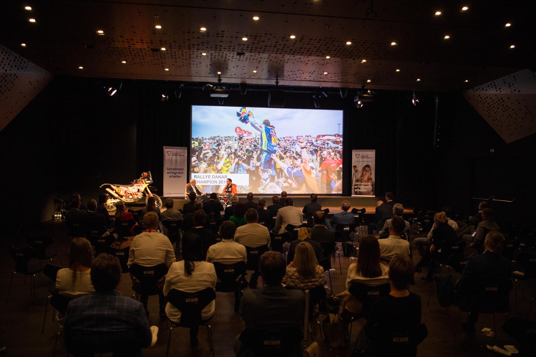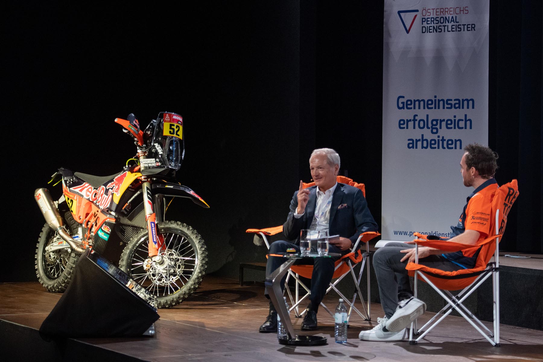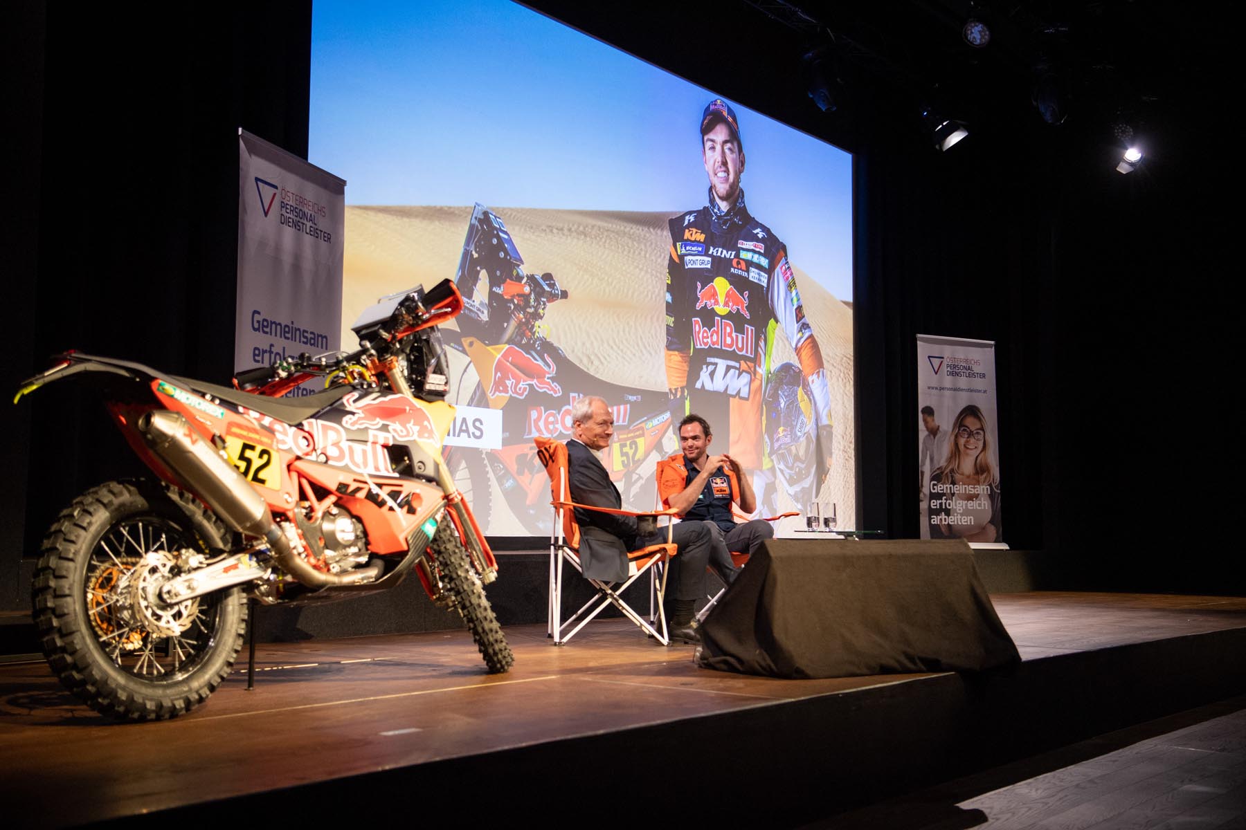Das größte Highlight des Tages war dann der Talk mit KTM Pilot Matthias Walkner – er hat uns in seiner bodenständigen und charmanten Art von seinen spektakulärsten Rennen berichtet und das Publikum konnte sich einen Eindruck davon machen, wie ein Renntag aussieht und welche Bürden man als Rallyefahrer auf sich nehmen muss. Mit gebrochenem Oberschenkel 12 Stunden auf das ersehnte Krankenhaus zu warten und dann fordert der operierende Arzt zunächst ein Selfie – da muss man Humor haben. Wahrscheinlich ist der Kindertraum vom „Rallyefahrer“ mit Adrenalin Pur gepaart mit vielen Entbehrungen und unter extremen Voraussetzungen nun für den ein oder anderen doch nicht mehr so attraktiv wie gedacht – wobei ein johlendes Publikum von bis zu 600.000 Personen in Südamerika etwas ist, was man nie vergisst. Doch auch hier ist Vorbereitung alles – ob Matthias Walkner das Schlafzimmer zur eigentlich sonst so besinnlichen Weihnachtszeit mit einem Höhenzelt ausstattet oder den Nachbaracker kurzerhand zu einer Rennstrecke umbaut – von nichts kommt nichts.